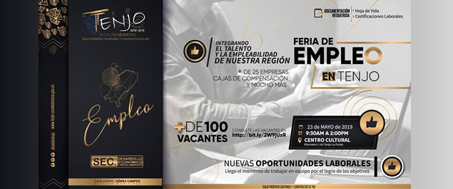 Este jueves 23 de mayo, la Alcaldía Municipal de Tenjo, a través de la Secretaría de Desarrollo Económico y Ambiente, realizarán desde las 9:30 a.m. y hasta las 2:00 pm, la Feria de Empleabilidad 2019, la cual busca fortalecer los canales de nuevas oportunidades laborales para las personas que se encuentran desvinculadas. En este espacio se contarán con más de 100 vacantes y 25 empresas que ofrecerán procesos para la selección de personal.
