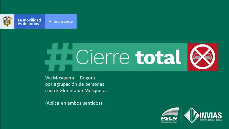 Por su parte #INVIAS informo que se mantiene cierre de la vía Mosquera – Bogotá, por agrupación de personas en la Glorieta de Mosquera