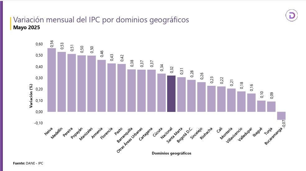 El informe del Dane señala que las ciudades que estuvieron por encima del promedio nacional de IPC para mayo de 2025 (0,32 %) fueron: Neiva con 0,56 %. Le siguen Medellín (0,53 %); Pereira (0,51 %); y Popayán y Manizales (0,5 %), principalmente.