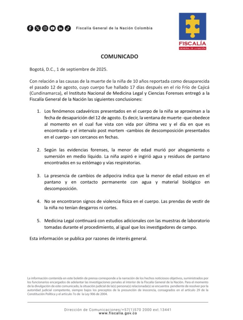 Medicina Legal, indicó que en el parte inicial del fallecimiento de Valeria Afanador, fue por ahogamiento.