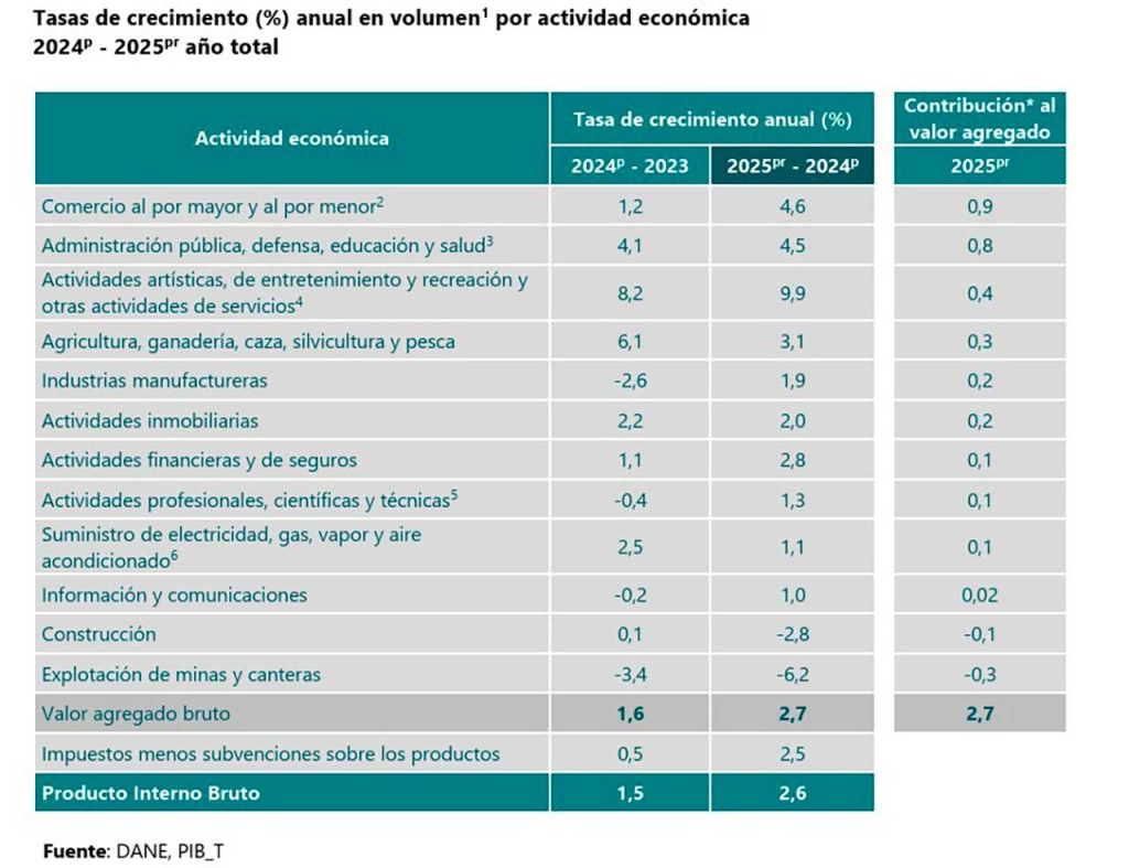 La economía colombiana creció 2,6% durante 2025, reveló el Dane