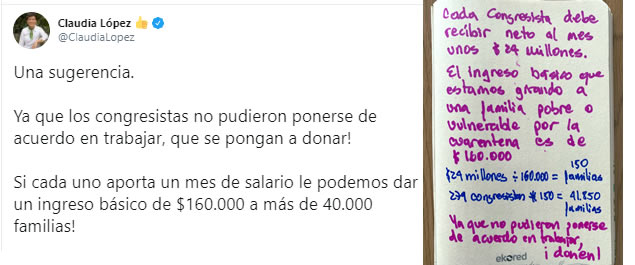 La mandataria en un tweet, les sugirió a los congresistas que si cada uno aporta un mes de salario se puede dar un ingreso básico de $160.000 pesos a más de 40.000 familias!