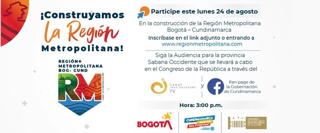 Con una audiencia pública para la provincia de Sabana Occidente que se llevará a cabo este lunes 24 de agosto, a partir de las 3:00 pm, se inicia el proceso de participación para la construcción de la ley orgánica que reglamenta la Región Metropolitana Bogotá Cundinamarca, figura mediante la cual se consolida la integración regional en el departamento.