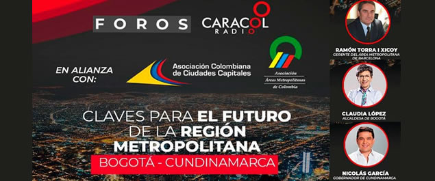 El evento, organizado por Foros Caracol Radio en alianza con Asociación Colombiana de Ciudades Capitales y la Asociación Áreas Metropolitanas de Colombia, se desarrollará en varios módulos informativos, el primer módulo contará con la intervención del Gobernador de Cundinamarca, Nicolás García, acompañado de la Alcaldesa de Bogotá, Claudia López y del Gerente del Área Metropolitana de Barcelona, Ramón Torra.