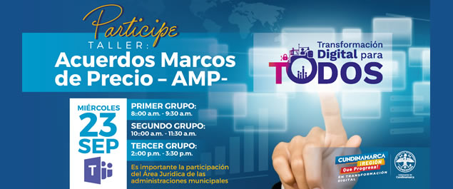 Este miércoles 23 de septiembre se llevará a cabo el taller virtual sobre los Acuerdos Marcos de Precio (AMP), dirigido a alcaldes, líderes TIC y encargados del área jurídica en las administraciones municipales.