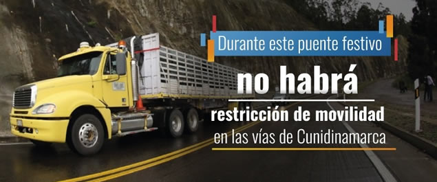 La Secretaría de Transporte y Movilidad de Cundinamarca informa que, de acuerdo con la directriz impartida por el Gobernador Nicolás García, no se ha dispuesto ninguna medida de restricción a la movilidad en las vías del departamento, durante este puente festivo de Todos los Santos, comprendido entre el sábado 31 de octubre y el lunes 2 de noviembre.