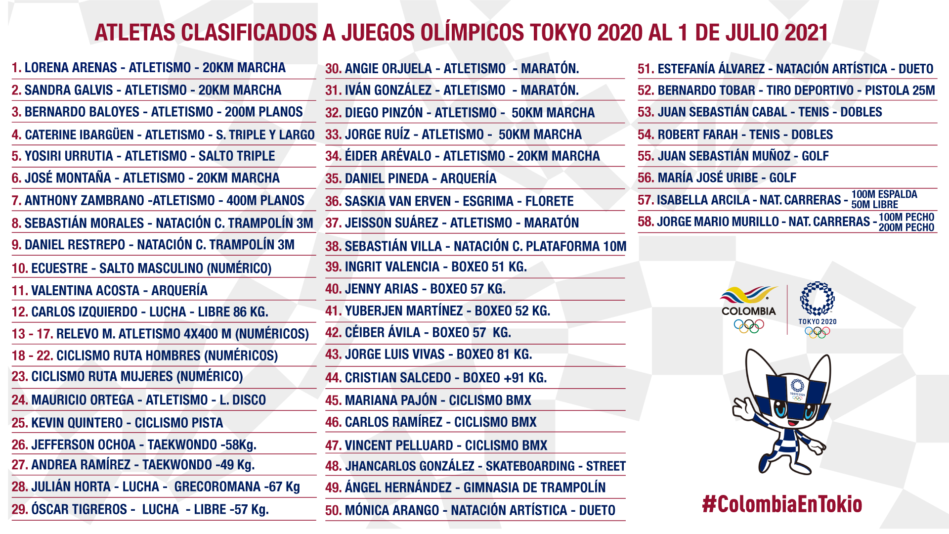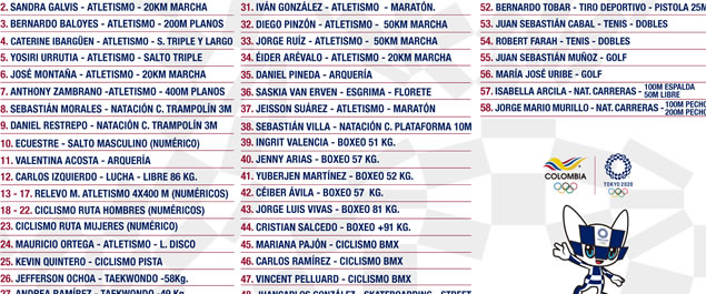 La historia de los clasificados por Colombia a Tokio se inició en 2019 con la marchista Lorena Arenas y continuó con los atletas Sandra Galvis, Bernardo Baloyes, Caterine Ibargüen, Yosiri Urrutia, José Leonardo Montaña, Anthony Zambrano y Mauricio Ortega, para luego sumar a los clavadistas Sebastián Morales y Daniel Restrepo, y el luchador Carlos Izquierdo.