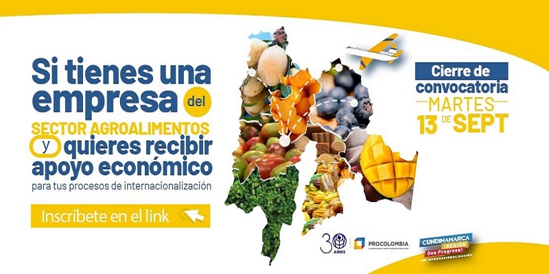 La Secretaría de Asuntos Internacionales en alianza con Procolombia, invitan a los empresarios a postularse en esta convocatoria que apoya en la cofinanciación del desarrollo de estrategias comerciales y promoción de productos cundinamarqueses en el exterior.
