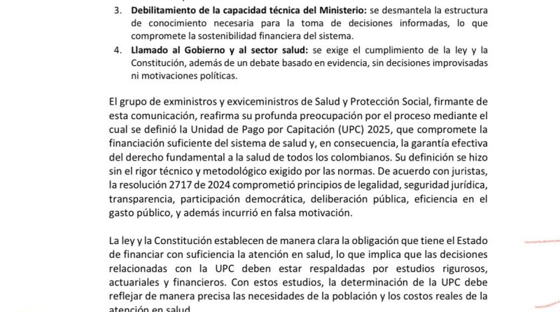 El grupo de exministros y exviceministros de Salud y Protección Social, firmante de esta comunicación, reafirma su profunda preocupación por el proceso mediante el cual se definió la Unidad de Pago por Capitación (UPC) 2025.