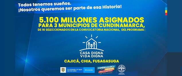 Leer másEn desarrollo de la primera convocatoria de la vigencia 2020 del Programa “Casa digna, Vida Digna” del Ministerio de Vivienda, Ciudad y Territorio, tres municipios de Cundinamarca recibirán recursos por más de $5.000 millones del programa en mención.